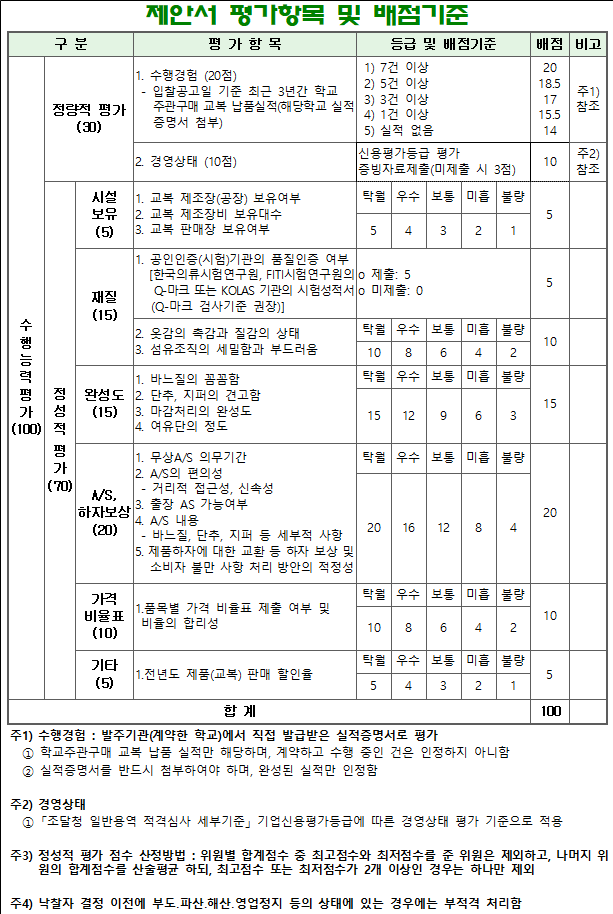 3) 낙찰업체는 본교와 계약 시 교복 1벌의 낙찰금액 산출서(품목별 단가표)를 제시하여야 함