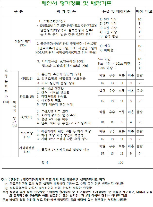 - 전년도 제품(교복) 납품을 희망할 경우, 제안서 제출 시 교복 1벌의 할인율, 계약 시 전년도 제품 1벌의 품목별 가격(품목별 단가표)을 제시
