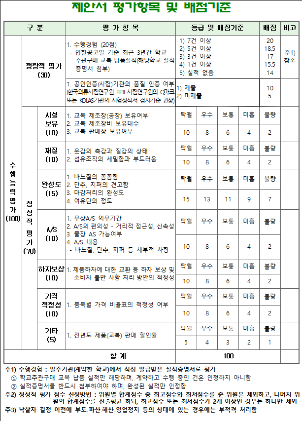 - 전년도 제품(교복) 납품을 희망할 경우, 제안서 제출 시 교복 1벌의 할인율, 계약 시 전년도 제품 1벌의 품목별 가격(품목별 단가표)을 제시