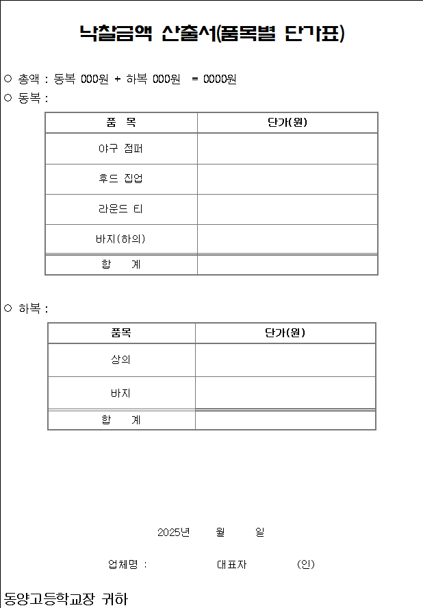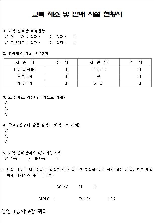 위 사업자는 서울시교육청의 교복가격 안정화를 위한 교복 ‘학교주관구매’ 실시에 따라, 동양고등학교(주소지 강서구 가양동)가 시행하는 교복 ‘학교주관구매’가 원만히 추진될 수 있도록 2025.00.00.(월)일자로 공고한 입찰에 참가하기에 신고합니다.
