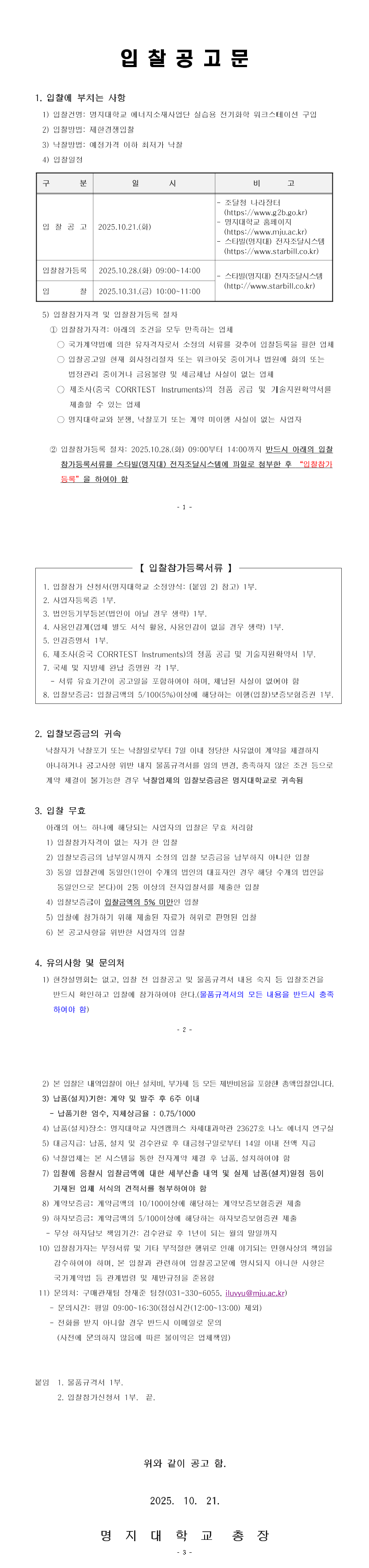 명지대학교 에너지소재사업단 실습용 전기화학 워크스테이션 구입 입찰 |