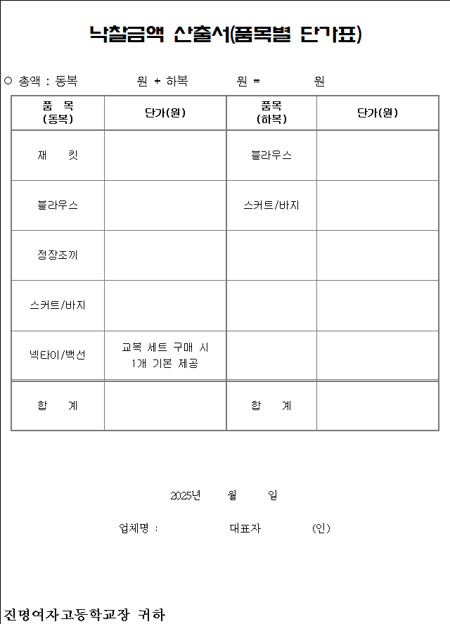 ● 낙찰업체는 본교와 계약시 입찰때 제출한 단가비율표에 의한 교복 1벌의 낙찰금액 산출서(품목별 단가표)를 제시하여야 함.