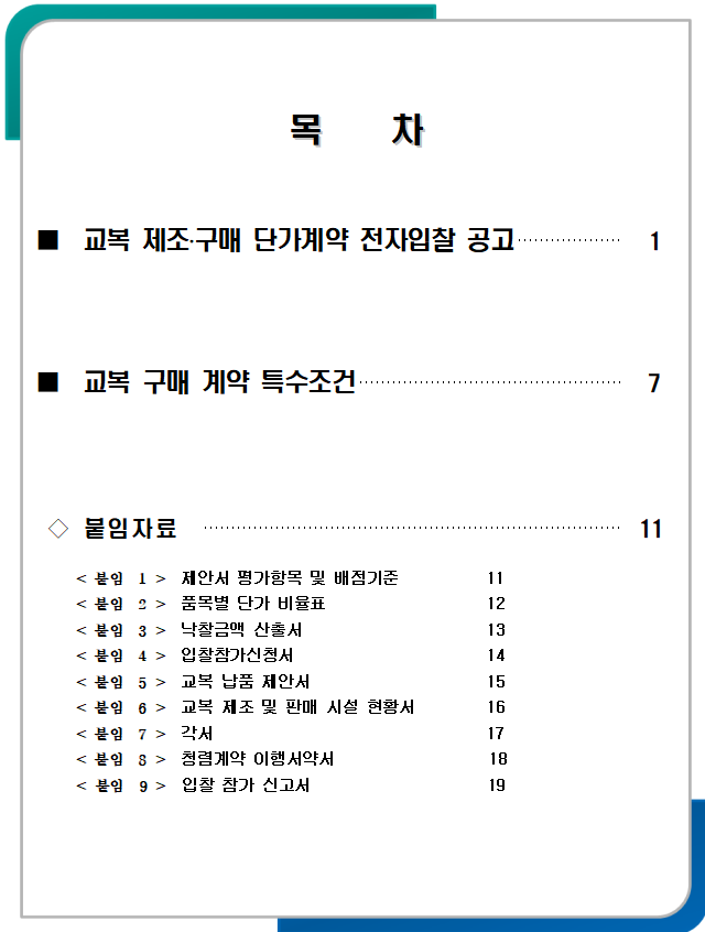 (1) 교복 납품 제안서< 붙임 5 > 11부(평가위원 10부 + 계약부서 보관용 1부)
