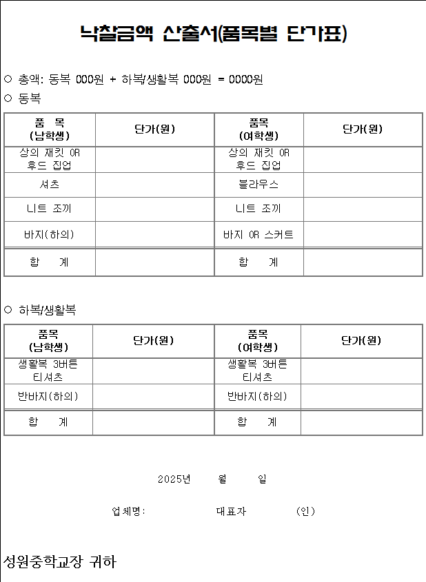 2026학년도 성원중학교 교복(동복, 생활복) 구매 단가계약 입찰 공고