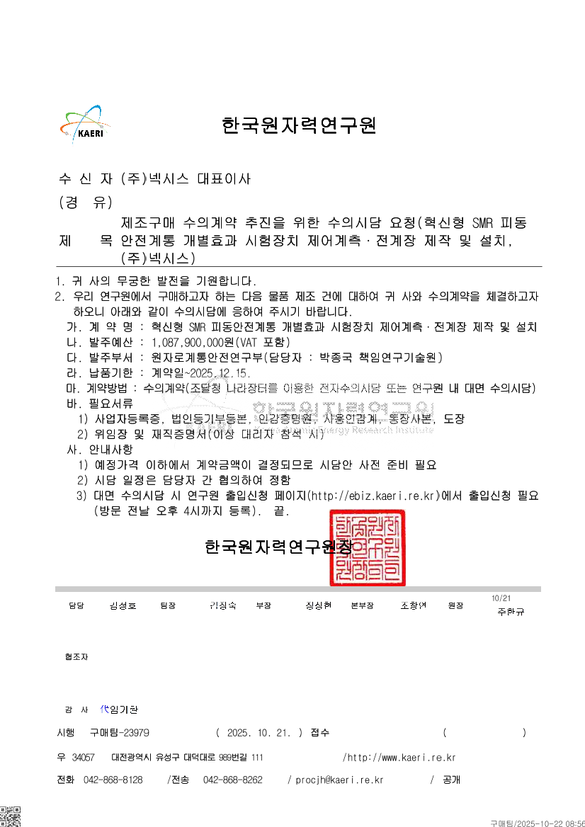 혁신형 SMR 피동안전계통 개별효과 시험장치 제어계측·전계장 제작 및 설치 |