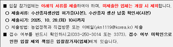 ▶ 물품구매시방서 및 내역서 등 사업관련 문의: 축산과 수산지원팀(☎033-250-3417)