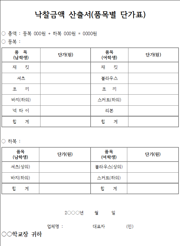 - 낙찰업체는 본교와 계약 시 교복 1벌의 낙찰금액 산출서(품목별 단가표)를 제시하여야 함