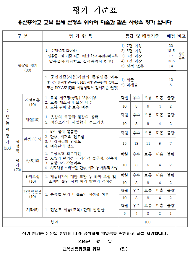 본인은 2026학년도 용산중학교 교복 제조·구매 입찰에 참여하면서 귀 학교에서 제시한 심사기준과 평가위원회에서 결정한 사항에 승복하고 그 결과에 대해서는 여타의 다른 이의를 제기하지 않겠습니다.