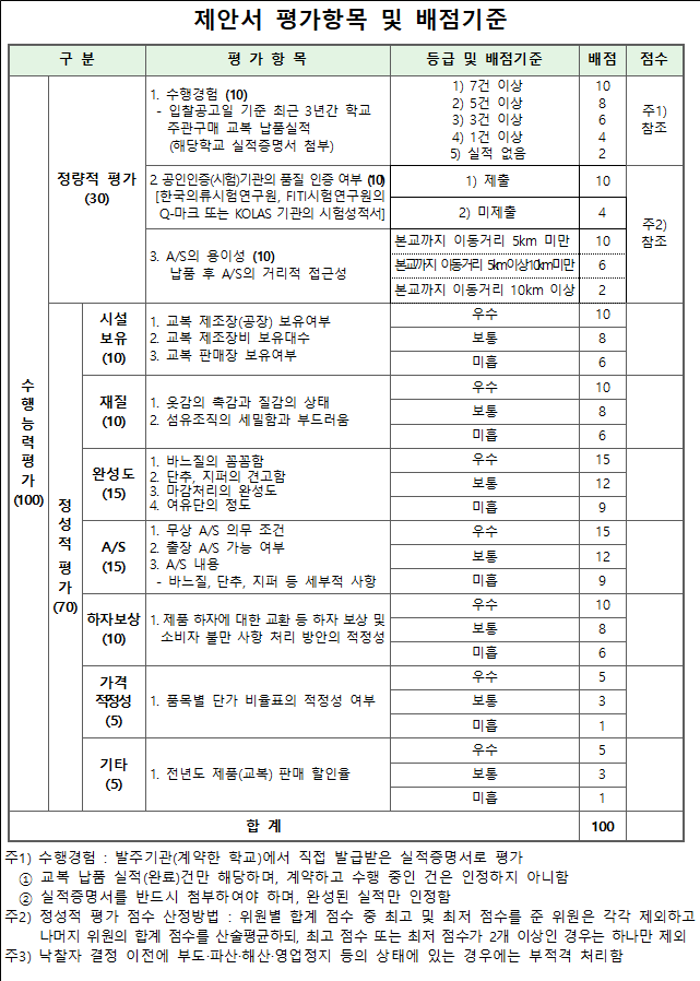 - 납품 후 해당연도에 한하여 전입생·재학생이 구매를 희망할 경우 1벌당 계약 단가 및 품목별 단가를 보장하여야 함