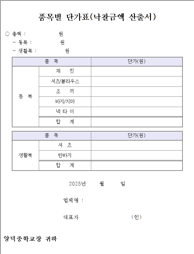 “2026학년도 양덕중학교 학교주관 교복(동복,생활복)구매” 업체 선정을 위해 다음과 같이 공고합니다.
