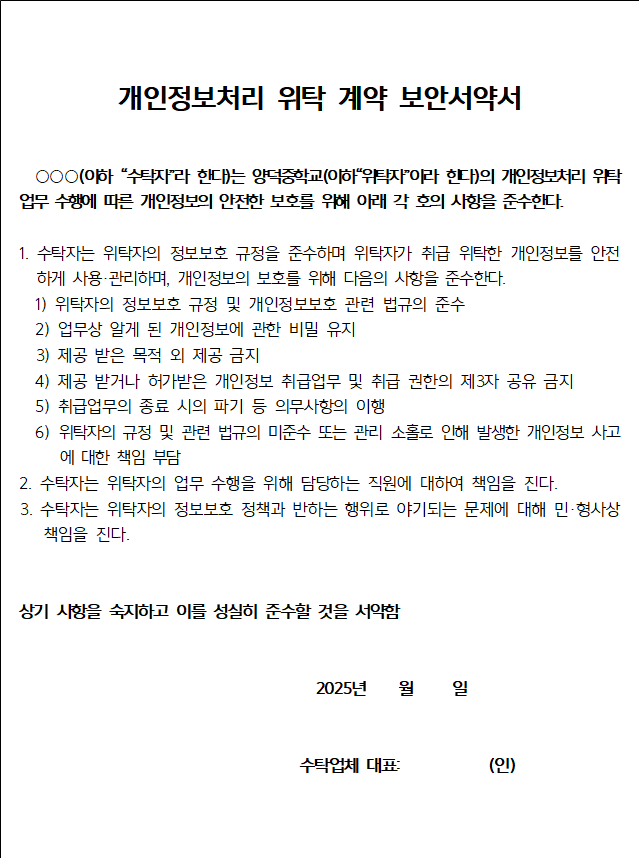 양덕중학교장(이하 “위탁자”이라 한다)과 ○○○(이하 “수탁자”이라 한다)는 “위탁자”의 개인정보 처리업무를 “수탁자”에게 위탁함에 있어 다음과 같은 내용으로 본 업무위탁계약을 체결한다.