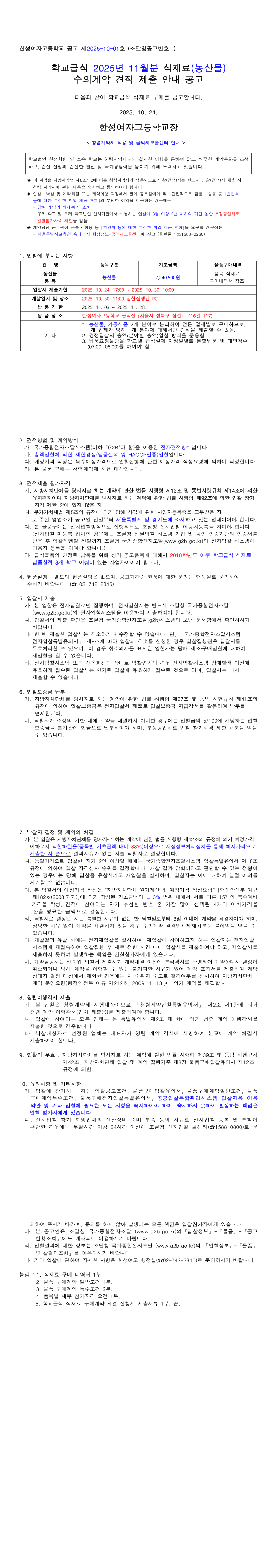 학교급식 2025년 11월분 식재료(농산물) 수의계약 견적 제출 안내 공고 |