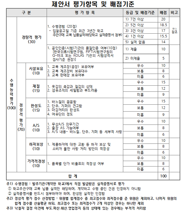 - 전년도 제품(교복) 납품을 희망할 경우, 제안서 제출 시 교복 1벌의 할인율, 계약 시 전년도 제품 1벌의 품목별 가격(품목별 단가표)을 제시