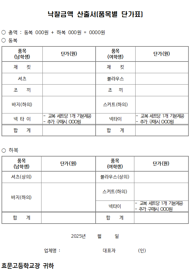 ● 낙찰업체는 본교와 계약시 입찰때 제출한 단가비율표에 의한 교복 1벌의 낙찰금액 산출서(품목별 단가표)를 제시하여야 함