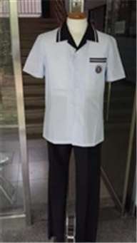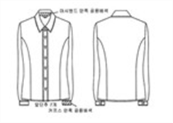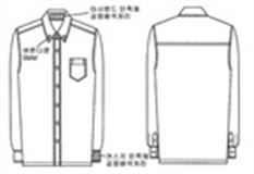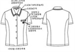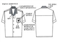 폴리에스테르 65%, 레이온 35%, 옅은 하늘색 세로 줄무늬 남방, 카라 및 앞주머니 윗 부분은 진회색, 카라와 앞주머니 라인은 옅은 하늘색 띠를 두름.