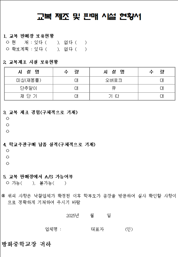 4) 교복 제조 및 판매시설 현황서(붙임 5) 1부