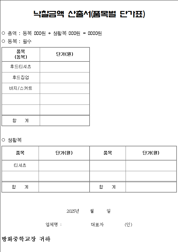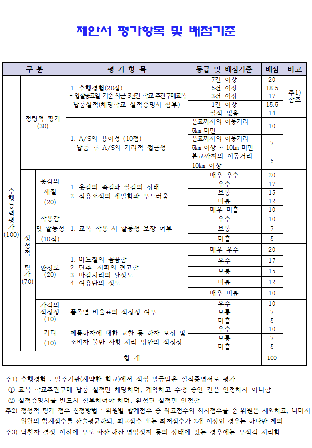 - 전년도 제품(교복) 납품을 희망할 경우, 제안서 제출 시 교복 1벌의 할인율, 계약 시 전년도 제품 1벌의 품목별 가격(품목별 단가표)을 제시
