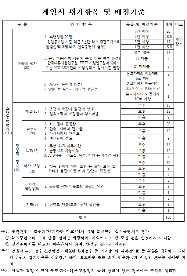 - 전학년도 제품(교복) 납품을 희망할 경우, 제안서 제출 시 교복 1벌의 할인율, 계약시 전학년도 제품 1벌의 품목별 가격(품목별 단가표)을 제시