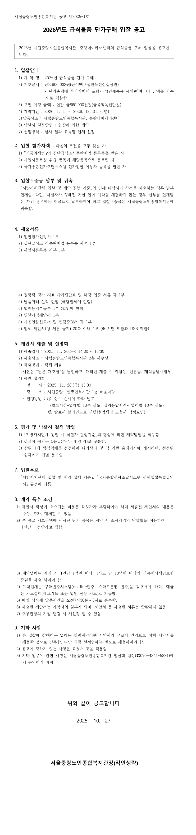 시립중랑노인종합복지관 2026년도 급식물품 단가구매 입찰 |