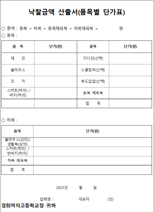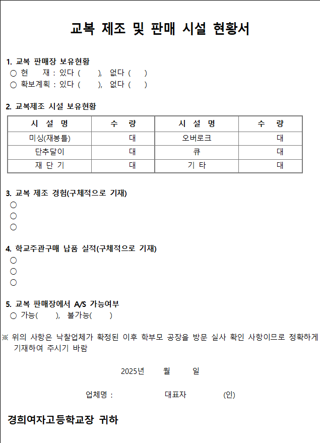 위 사업자는 서울시교육청의 교복가격 안정화를 위한 교복 ‘학교주관구매’ 실시에 따라, 경희여자고등학교(주소지 : 서울 동대문구 경희대로26)가 시행하는 교복 ‘학교주관구매’가 원만히 추진될 수 있도록 2025년 월 일자로 공고한 입찰에 참가하기에 신고합니다.