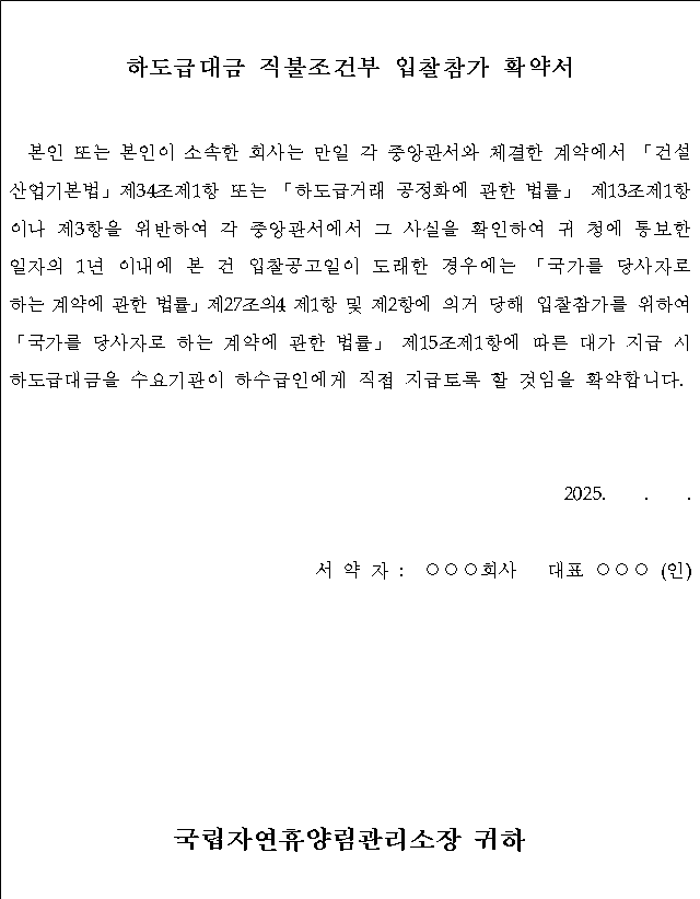 2.4. 「국가계약법」 제27조의5 및 「국가계약법 시행령」 제12조 제3항에 따라 ‘조세포탈 등을 한 자’로서 유죄판결이 확정된 날부터 2년이 지나지 아니한 자 및 부정당업자로 지정된 자는 입찰에 참여할 수 없습니다. 입찰자는 입찰서 제출 시 「국가계약법 시행령」 제12조 제3항 각호에 해당하지 아니한다는 【붙임1】서약서를 제출하여야 합니다.