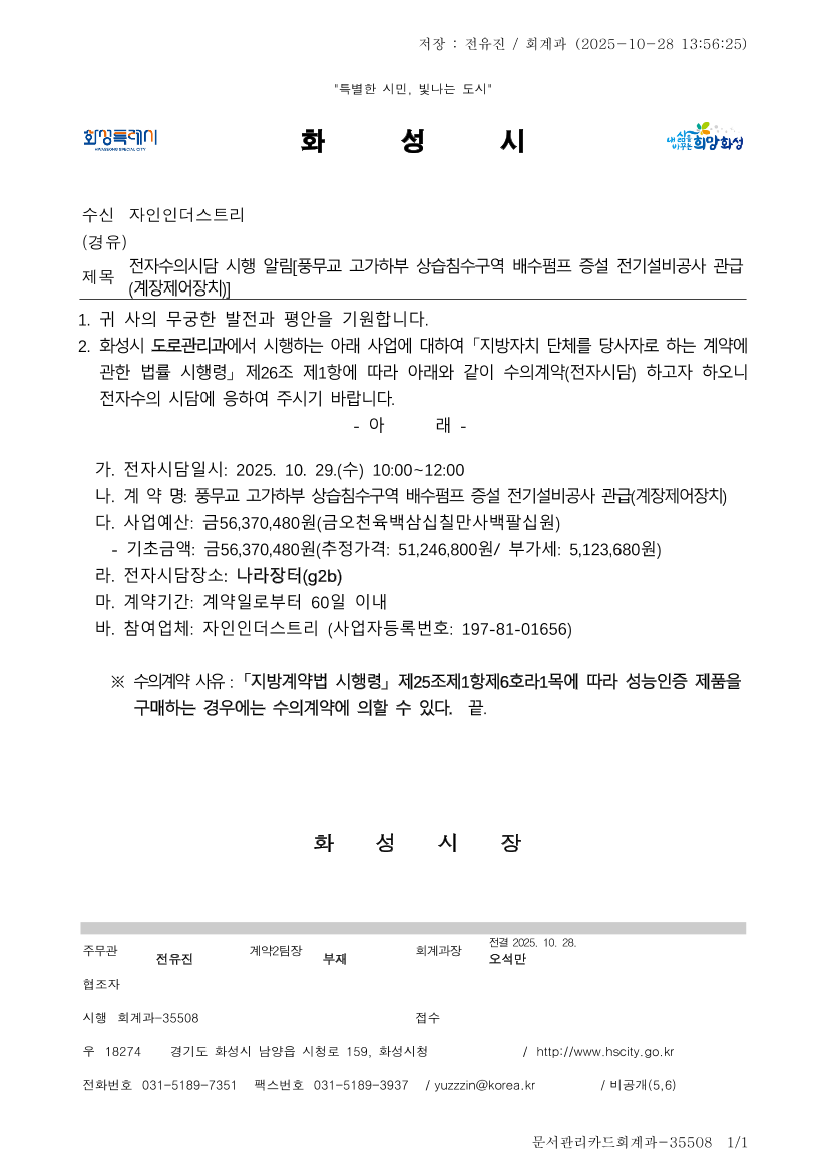 풍무교 고가하부 상습침수구역 배수펌프 증설 전기설비공사 관급(계장제어장치) |