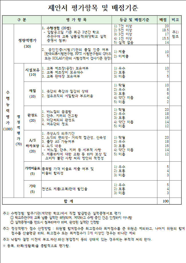 - 전년도 제품(교복) 납품을 희망할 경우, 제안서 제출 시 교복 1벌의 할인율, 계약시 전년도 제품 1벌의 품목별 가격(품목별 단가표)을 제시