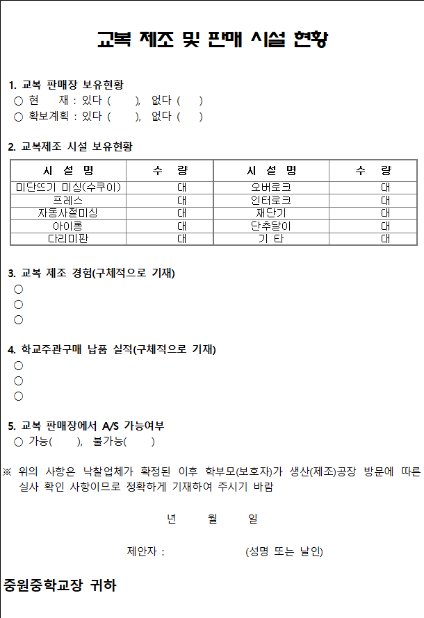 본 업체가 중원중학교 교복(동.하복) 학교주관구매 업체로 선정될 경우, 본 업체에서 제작하여 출시한 중원중학교 교복(동.하복)에 대한 소비자 불만 사항에 대하여 다음과 같이 성실히 조치할 것을 약속합니다.