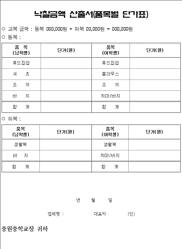 ○ 낙찰업체는 본교와 계약시 입찰때 제출한 단가비율표에 의한 교복 1벌의 낙찰금액 산출서(품목별 단가표)를 제시하여야 함