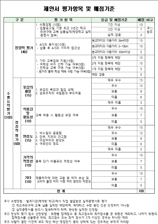 o 낙찰업체는 본교와 교복 구매 계약 시 교복(동복 및 하복) 1벌의 품목별 가격을 구분하여 제시하여야 함