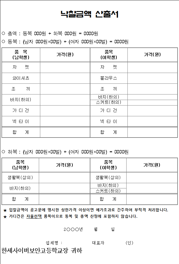 한세사이버보안고등학교 교복 제조․구매 입찰 공고