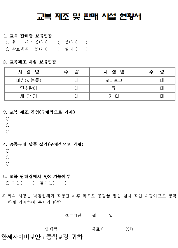 위와 같이 한세사이버보안고등학교 교복선정위원회에서 실시한 입찰에 참여한 공급업체로서 제품하자교환 및 보상계획서를 제출 합니다.