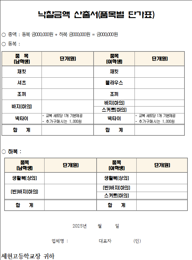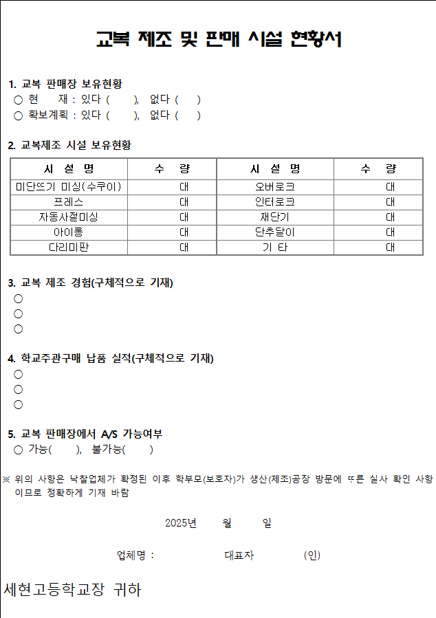 |   |   |   |   |   |   |   |     주) 입찰공고일 기준 최근 3년 간 실적을 최근 연도순으로 기재      ★ 학교주관구매 교복 납품 실적만 해당되며, 계약하고 수행 중인 건은 인정하지 아니합니다.      ★ 실적증명서를 반드시 첨부하여야 하며, 완성된 실적만 인정합니다.    3. 교복 납품 실행 계획(별지로 첨부할 것)    4. 교복 납품에 있어 업체의 특,장점을 상세히 기술(별지로 첨부할 것)      5. A/S 계획(붙임 4-1 서식 작성)    6. 제품 하자에 대한 교환 등 하자 보상 및 소비자 불만 사항 처리 방안(붙임 4-2 서식 작성)    2025.   .     .    제안자   성  명           (서명 또는 날인)    세현고등학교장 귀하  【붙임 4-1】교복 A/S 계획서    교복 A/S 계획서    1. A/S 편의성    가. 거리 접근성:   (주소지 기재)    나. 신속성:        (A/S 완료까지 소요되는 기간 기재)        2. 출장 A/S 가능여부(가능한 경우 출장 A/S 최소 학생 수 기재)        3. A/S 내용    가. 시설 현황, A/S 관련 시설 및 수량 기재(재단기, 오버로크 등)    나. A/S 세부내용 바느질, 단추, 지퍼 등 세부적 사항 기재    다. 무상 A/S 가능 항목(무상 A/S 기간 등 수선 항목 기재)      이상의 기재 내용은 사실과 같으며 다를 경우  어떠한 불이익도 감수할 것을 확약합니다.      2025년    월    일    제안자  성  명      (서명 또는 날인)        세현고등학교장 귀하          【붙임 4-2】하자 보상(교환) 및 소비자 불만 해결 방안    하자 보상(교환) 및 소비자 불만 해결 방안      업체(상호)명: ______________                      사업자등록번호: ______________  업체 대표자: ______________        본 업체가 세현고등학교 교복 계약 대상자로 선정될 경우, 본 업체에서 제작하여 출시한 세현고등학교 교복에 대한 소비자 불만 사항에 대하여 다음과 같이 성실히 조치할 것을 약속합니다.  ※ 제품 하자에 대한 교환 등 소비자 불만 사항에 대한 처리 방안을 구체적으로 제시