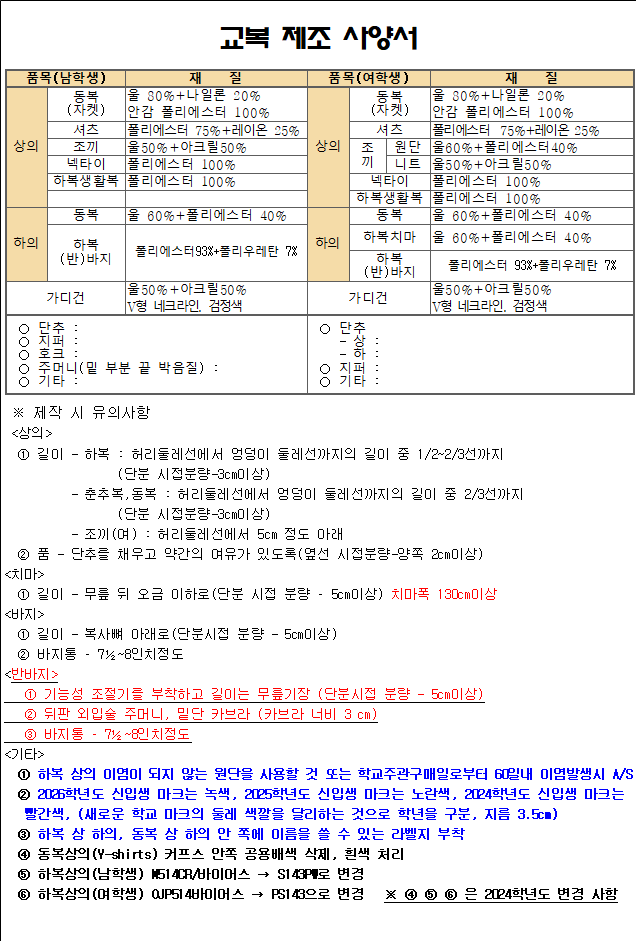 | 규    격  | ○ 교복 사양서 참조 [붙임 12, 2024학년도 변경사항 반드시 확인 요망]  |