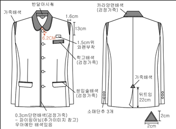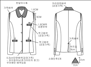 | 1. 동복(4pcs)     가. 남자 : 상의 재킷, 셔츠, 니트 조끼(타이 포함), 하의 바지    나. 여자 : 상의 재킷, 블라우스, 조끼(타이 포함), 하의 스커트나 바지 중 선택 가능  2. 하복(2pcs)      가. 남자 : 상의는 생활복형 교복, 하의는 바지나 반바지 중 선택 가능    나. 여자 : 상의는 생활복형 교복, 하의는 스커트나 반바지 중 선택 가능  |    |