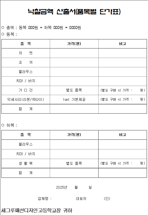 ● 낙찰업체는 본교와 계약 시 입찰때 제출한 단가비율표에 의한 교복 1벌의 낙찰금액 산출서(품목별 단가표)를 제시하여야 함