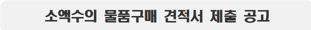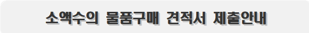 |     이 견적서 제출에 참가하는 자는 다음의 안내서를 구성하는 공고서 및 각종 규정 등을 반드시 열람하고 숙지하여야 하며, 숙지하지 못함에 따라 발생하는 모든 책임은 입찰자에게 있음을 알려드립니다.  -  다        음  -       1. 소액수의 물품구매 견적서 제출안내 공고     2. 국가종합전자조달시스템 전자입찰특별유의서(조달청고시)     3. 국가종합전자조달시스템 입찰참가자격등록규정(조달청고시)     4. (계약예규) 정부 입찰·계약 집행기준(기획재정부계약예규)     5. (계약예규) 물품계약일반조건(기획재정부계약예규)     6. (계약예규) 물품구매(제조)입찰유의서(기획재정부계약예규)     7. 물품구매계약 품질관리 특수조건(조달청 지침)     8. 물품구매(제조)계약 특수조건(조달청 지침)     9. 시운전조건부계약 추가특수조건(조달청 지침) *필요 시     10. 기타 입찰‧계약 관련 법령 및 규정     ※ 입찰공고일(재공고 시에는 최초 공고일) 기준 현행규정을 적용하며, 현행규정은 국가법령정보센터 홈페이지(www.law.go.kr)에서 참고하시기 바랍니다.