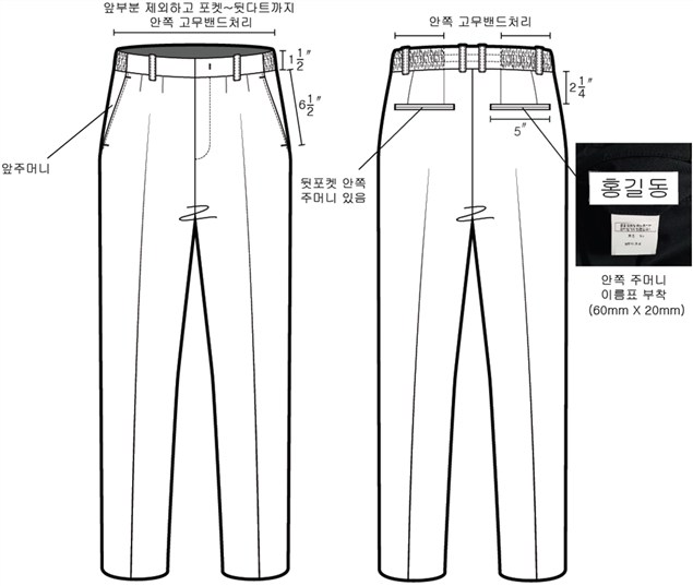 ◉ 앞 양주머니, 지퍼, 이름표 부착