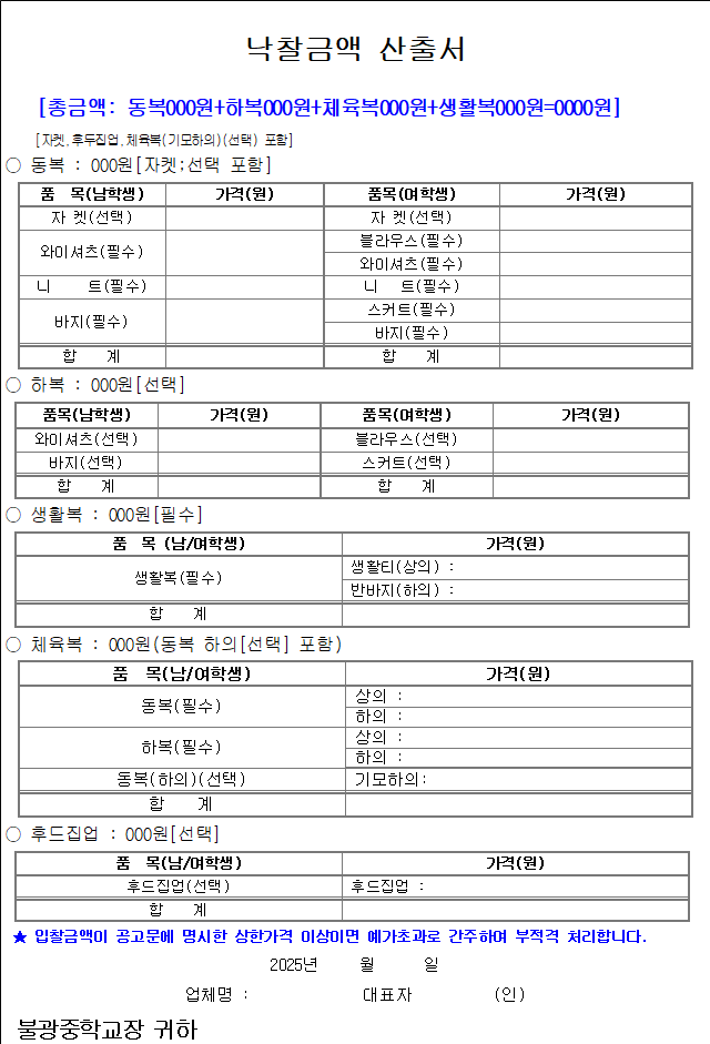 ● 낙찰업체는 본교와 계약 시 교복 1벌의 낙찰금액 산출서(품목별 단가표)를 제시하여야 함