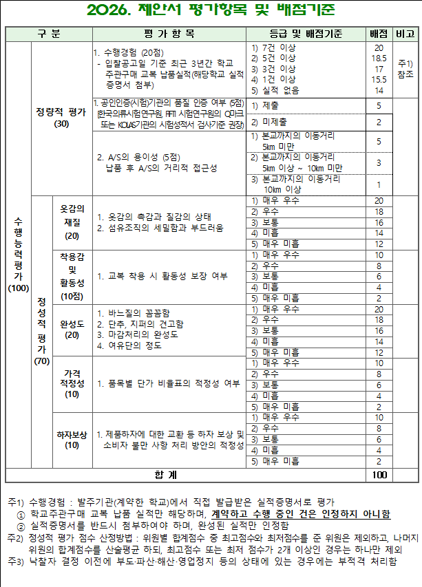 ※ 계약상대자로 선정된 업체는 본교와 교복 구매 계약 시 교복(동복·하복) 1벌의 품목별 가격을 구분해서 제시하여 본교 학생(재학생포함)이 필요에 따라 품목별로 추가 구매할 수 있도록 보장하여야 합니다.