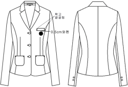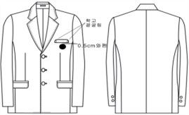 | 1. 단추(지정단추)   - 앞단추 3개(지름 18mm)   - 소매단추 2개(지름 15mm)  2. 가슴주머니 5cm 아래 교표  3. 가슴주머니 끝 굴림  4 아래 주머니 뚜껑 있음  4. 길이는 허리선 아래      5cm 이상 겹치도록 할것  5. 소매시접 4cm 이상  6. 겉으로 상표가 드러나지 않     아야함  7. 여분단추 1개 이상 필수  |