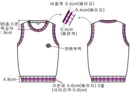 |       1. 라운드넥,소매 밴드 중앙   - 가운데 0.4cm 베이지색 2줄  2. 왼쪽 가슴 위치 교표  3. 밑단 밴드 가운데 0.6cm    베이지 배색 2줄  4. 겉으로 상표가 드러나지 않     아야함      |