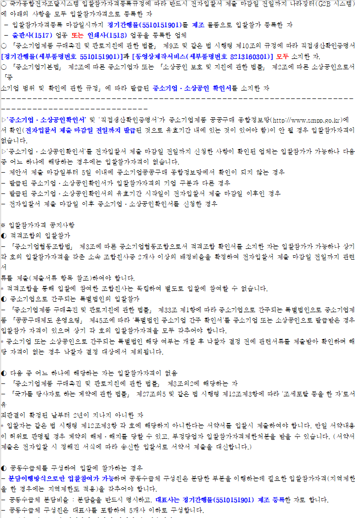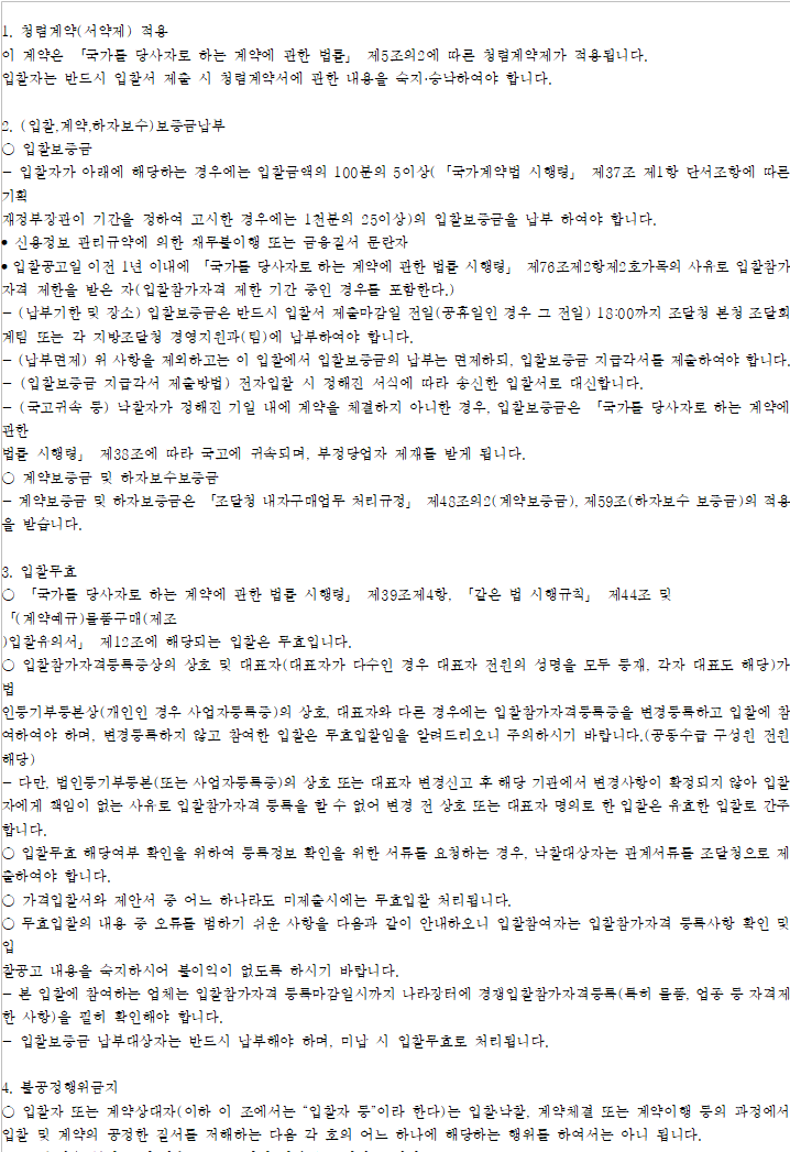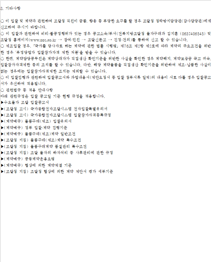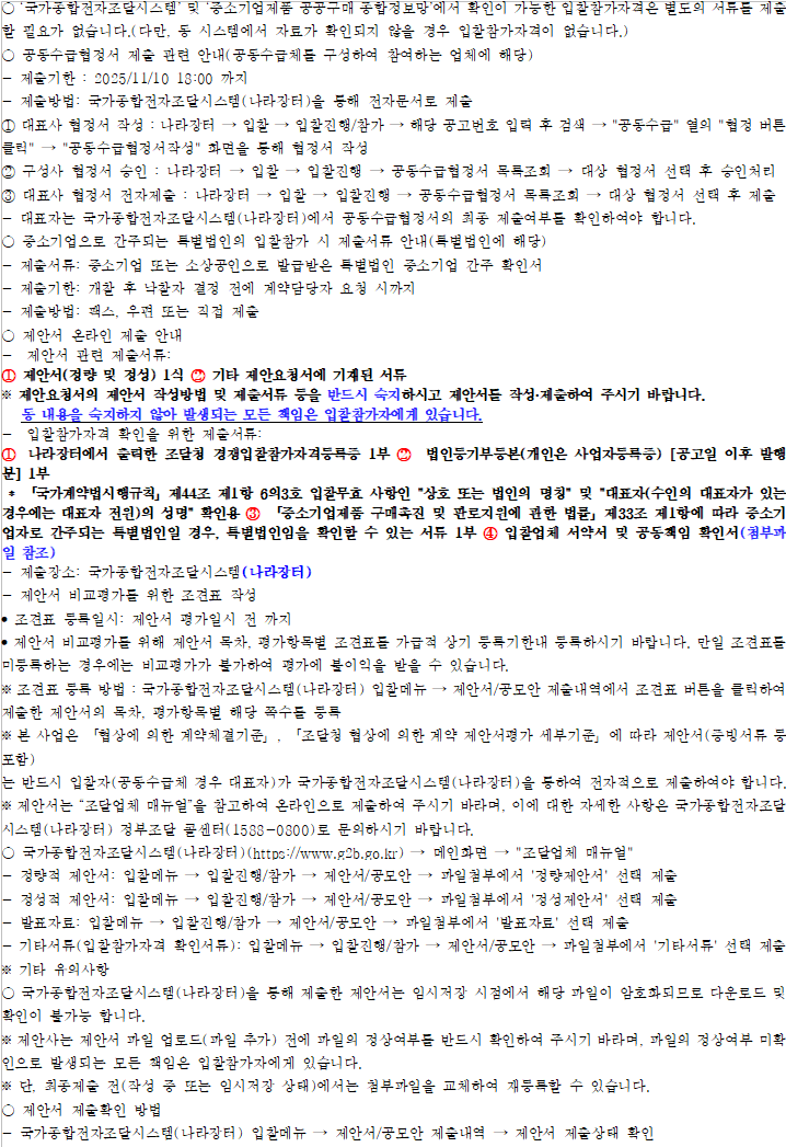| 1. 제안서 평가 기관 : 조달청(정성평가)   2. 제안서 평가 일시 : 2025/11/18 13:30   3. 제안서 평가 장소 : 전북지방조달청 2층 회의실(전북특별자치도 전주시 덕진구 백제대로 709)   4. 평가위원 사전검토 및 질의 등록시간 : 2025/11/18 13:30 ~ 15:30   5. 입찰자의 답변등록 시간 : 2025/11/18 13:30 ~ 16:00  * 평가위원 의견등록 및 입찰자 답변등록 시간은 별도 안내되며, 평가진행 상황에 따라 협의 · 조정될 수 있습니다.   6. 제안서 평가 방식 : 오프라인(현장) 서면평가  * 별도 제안서 발표는 하지 않습니다.(단, 입찰 참여업체는 나라장터에서 실시간 온라인 답변등록)  ※ 본 건은 추정가격 5억 미만 사업으로 별도 제안서 발표는 없으나, 평가진행시 평가위원이 제시한 질의에 대하여 해당 업체별로 실시간 온라인(나라장터) 답변등록해야 합니다.    ▶ 나라장터>입찰>조달평가>업체평가목록>해당사업의 '평가수행'> → 실시간 질의응답    ▶ 나라장터-e-고객센터-이용안내-나라장터이용안내-나라장터사용자매뉴얼- 제목 : [조달업체] (조달평가) 사용자 매뉴얼(퀵가이드 및 화면) 참조   * 평가위원만 오프라인 참석(전북조달청)하여 평가하며, 입찰 참여업체는 오프라인 참석하지 않습니다.   7. 평가위원 제안서 사전검토 : 「조달청 협상에 의한 계약 제안서 평가 세부기준」제10조 제6항 각호      에 따른 제안서 검토시간을 가지며, 제 7항에 따라,단축하거나 연장할 수 있습니다.  ※ 제안서평가 관련사항이 부득이한 사유로 변경될 수 있으며, 변경되는 경우에는 제안서를 제출한 입  찰자에게 개별 통지 또는 나라장터에 공지합니다.   |