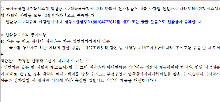 | 물품등록구분  | 관련없음 (경쟁입찰참가자격등록증에 공고서상 물품분류가 공급 또는 제조물품으로 등록되어 있어야 함)  |