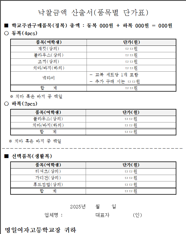 |       교복 학교주관구매 입찰 참가 신고서                    사업자 상호 :                                     사업자 번호 :                                       사업자 대표 :                            위 사업자는 서울시교육청의 교복 가격 안정화를 위한 교복 학교주관구매실시에 따라, 명일여자고등학교(주소지 : 서울특별시 강동구 명일로 350)가 시행하는 「교복 학교주관구매」가 원만히 추진될 수 있도록 2025년 10월 31일자로 공고한 입찰에 참가하기에 신고합니다.