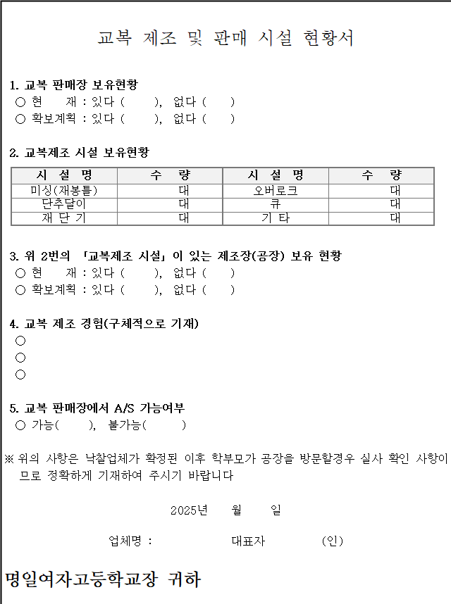 6. 기타 제안서 평가를 위한 자료 일체     2025년    월     일    제안자   성  명                (서명 또는 날인)    명일여자고등학교장 귀하  【붙임7】교복 제조 및 판매 시설 현황서
