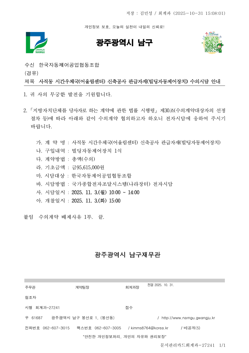 | 공고명 | 사직동 시간우체국(어울림센터) 신축공사 관급자재(빌딩자동제어장치) |