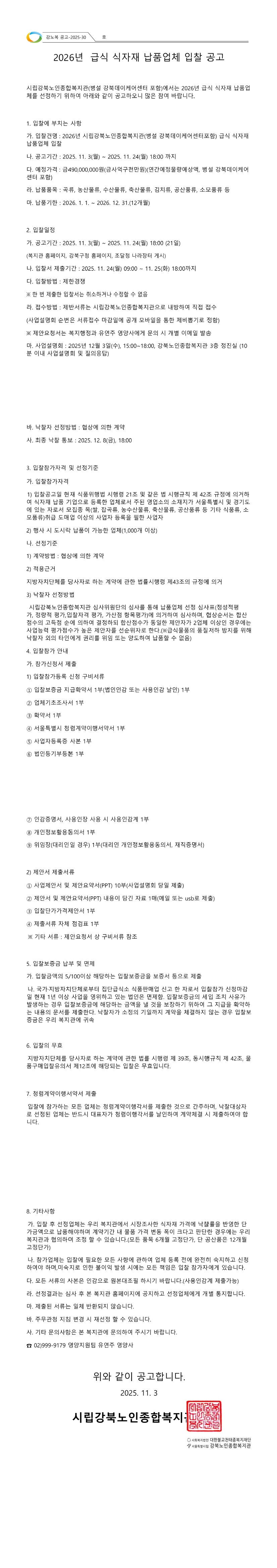 2026년 급식 식자재 납품업체 입찰 공고 |