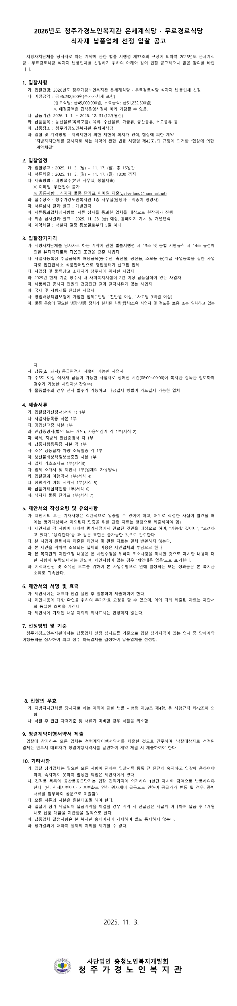 2026년도 청주가경노인복지관 은세계식당, 무료경로식당 식자재 납품업체 선정 입찰 공고 |