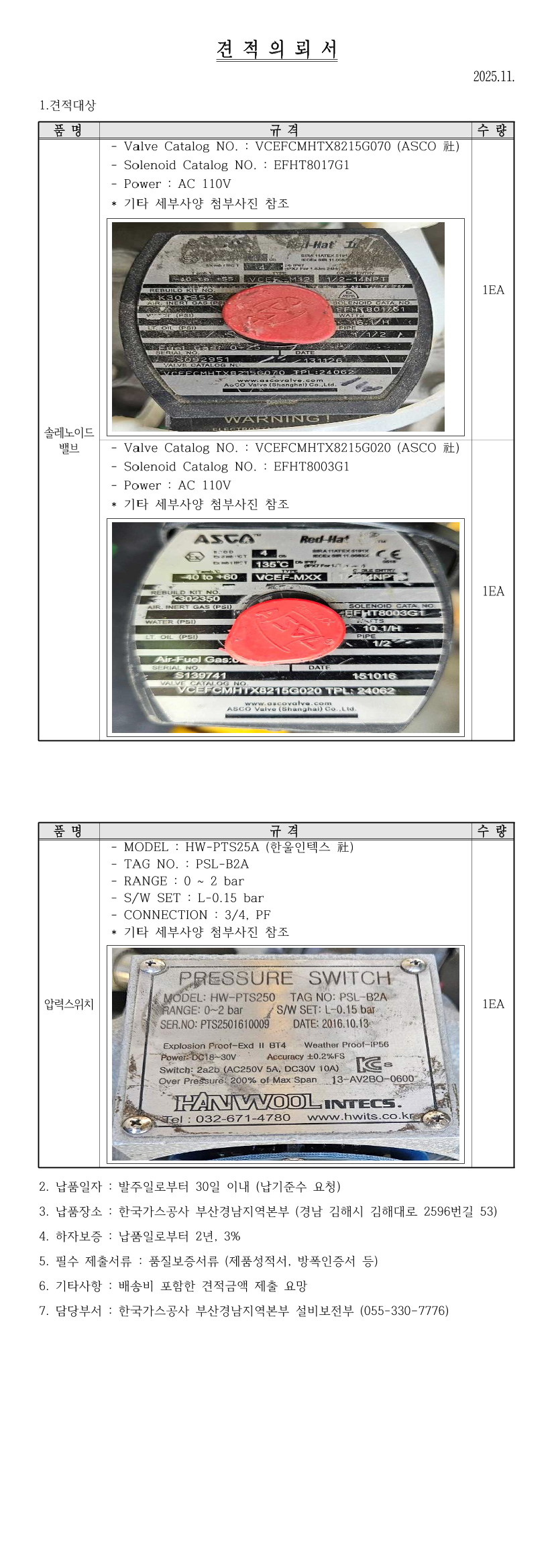 [전자견적 수취] 압력스위치 및 솔레노이드 밸브 |
